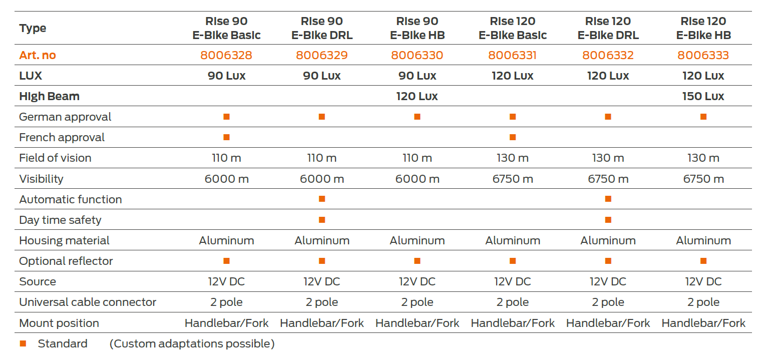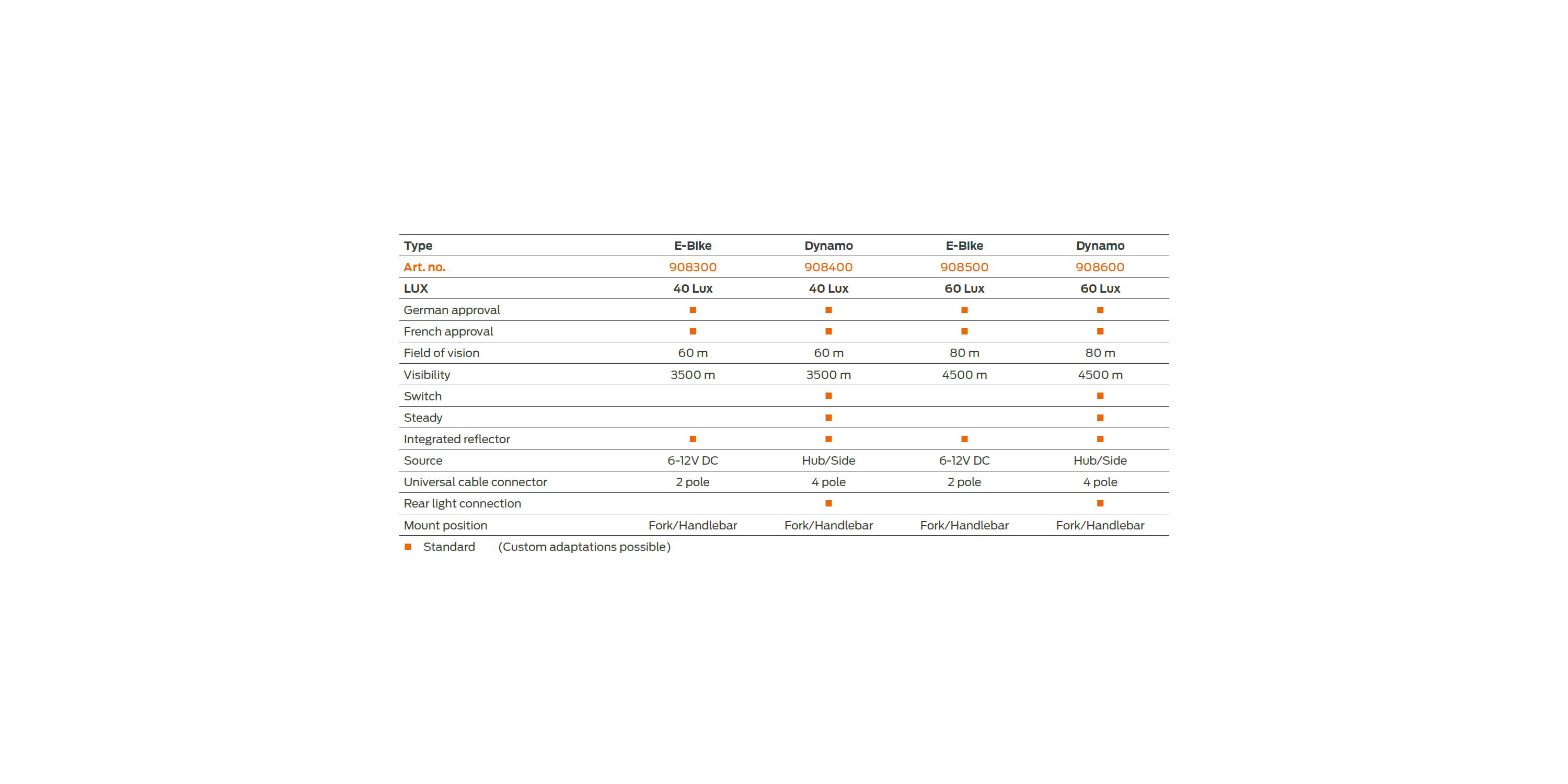 • Standardized cable connector: Dynamo = 4 pole, E-Bike = 2 pole.